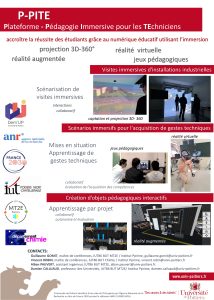 Les départements MT2E et Chimie vous proposent de venir découvrir la Plateforme : Pédagogie Immersive pour les TEchniciens (P-PITE) mettant en œuvre des outils numériques immersifs comme la réalité augmentée, la réalité virtuelle ou des jeux pédagogiques.